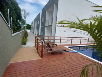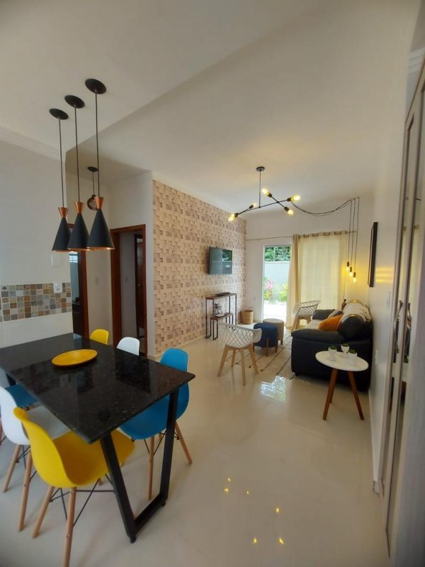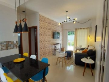 Apartamento terreo completo, todo mobiliado com 2 quartos, acomoda até 6 adultos e uma crianca, em condominio com piscina, churrasqueira e estacionamento.