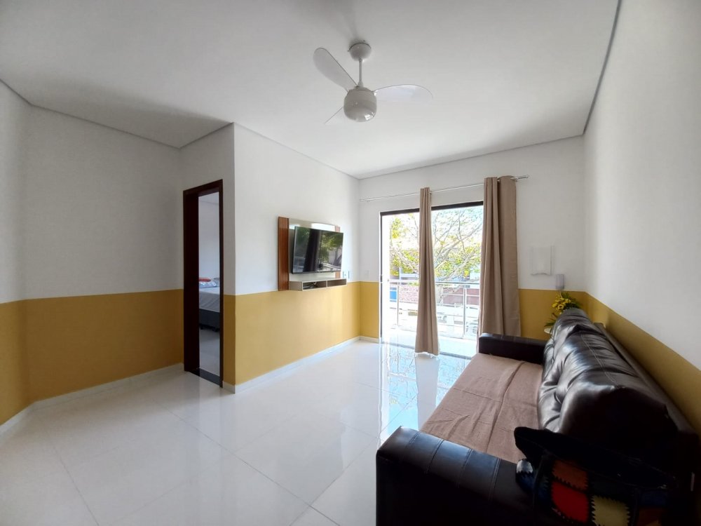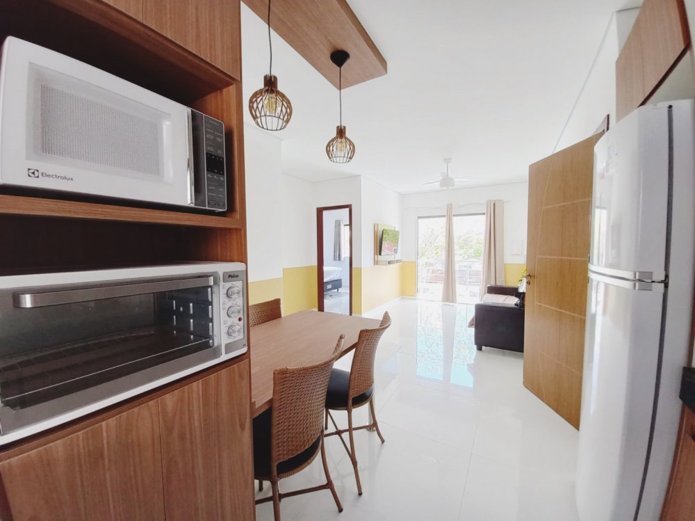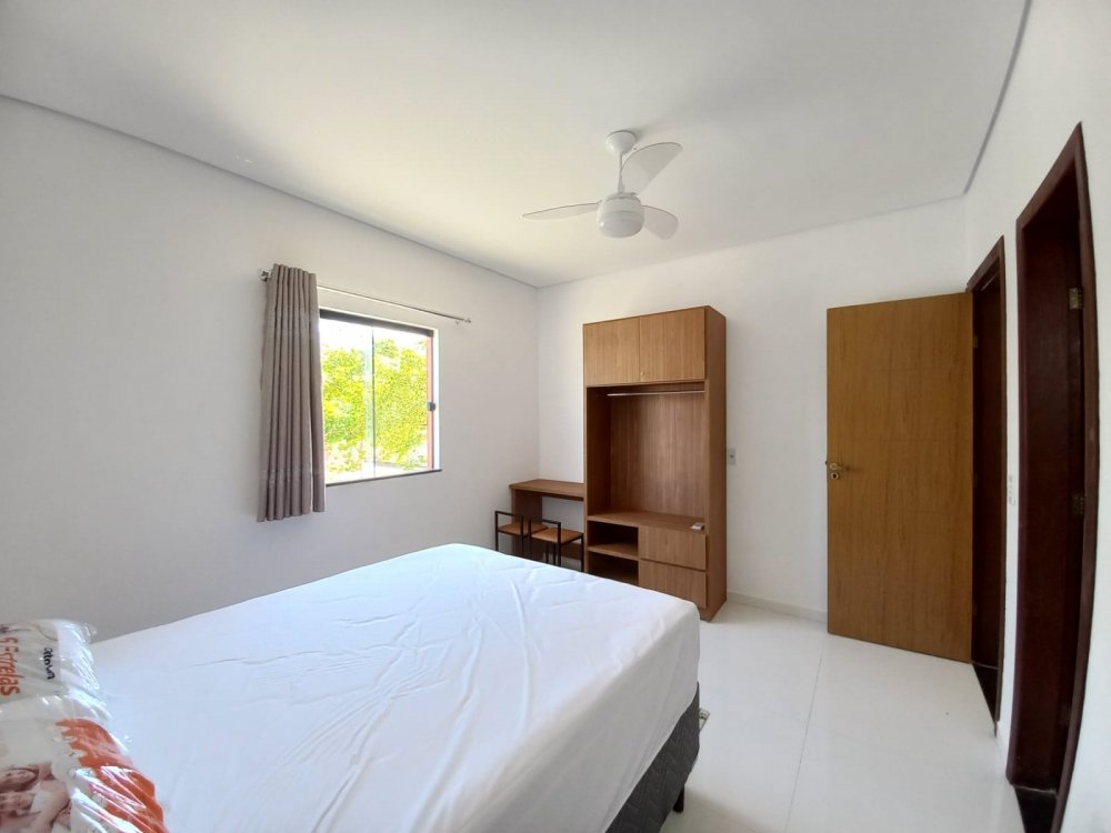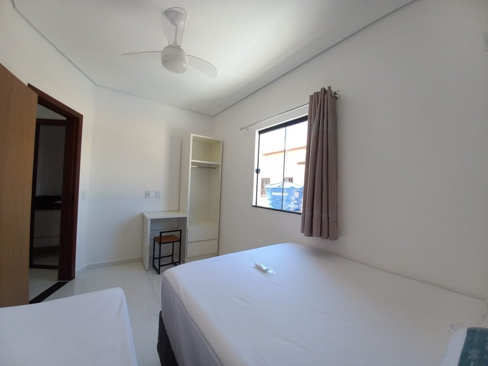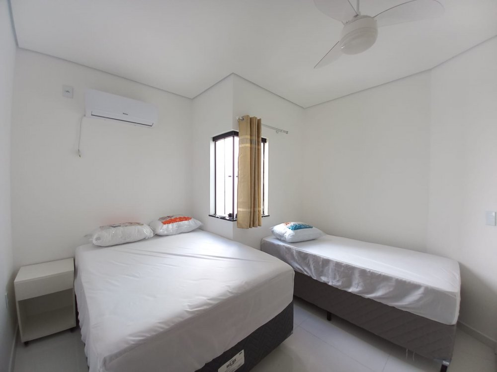 Apartamento no piso superior com 3 quartos com ar condicionado, sendo 1 suite, um banheiro social, mobiliado, com internet, TV, sala, cozinha, varanda, em condomínio com piscina, churrasqueira e vaga de carro, 3 minutos da Praia de Taperapuan, perto da Barraca do Gaucho.