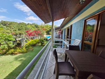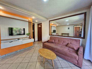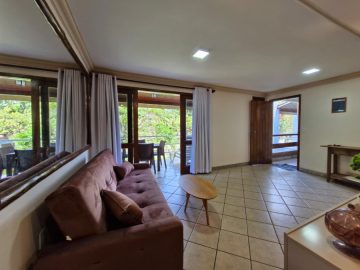 Apartamento de 2 quartos sendo 1 suite, piso superior, mobiliado, com sala, cozinha, ar condicionados, banheiros, varanda, em condomínio com áreas verdes e piscina e vaga de estacionamento, 3 minutos de carro da Praia de Taperapuan